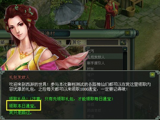 通宝获得方法:东海渔村-礼包发放人-领取本日通宝